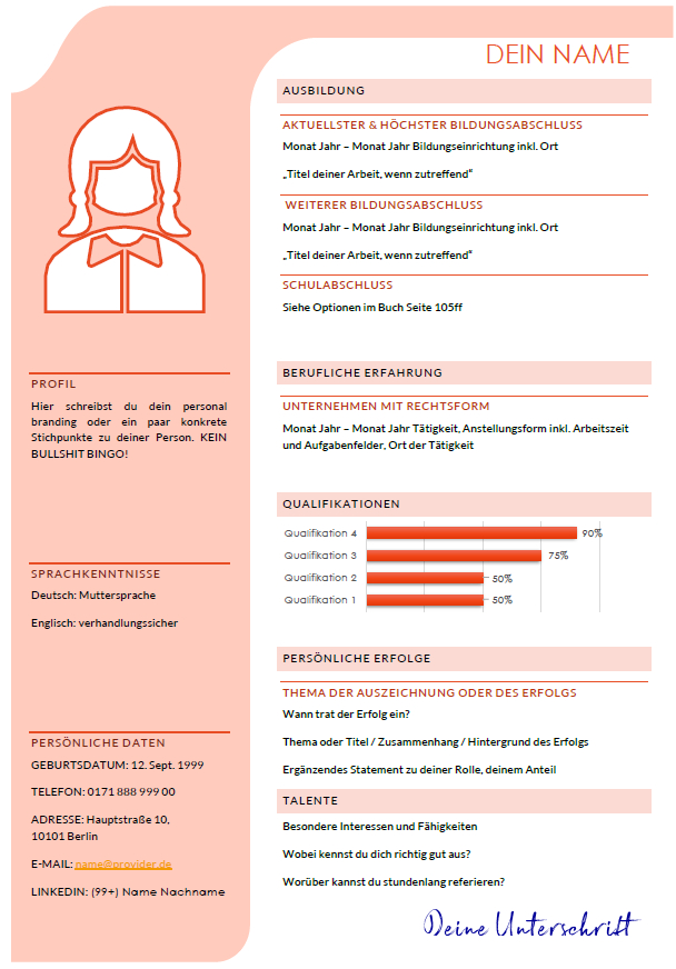 Ein tabellarischer Lebenslauf mit Profil-Spalte links für dein Foto und persönliche Daten und einem Balkendiagramm im Mittelteil.