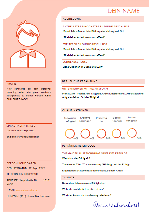 Ein tabellarischer Lebenslauf mit Profil-Spalte links für dein Foto und persönliche Daten und einem zweifarbigen Kreisdiagramm im Mittelteil.