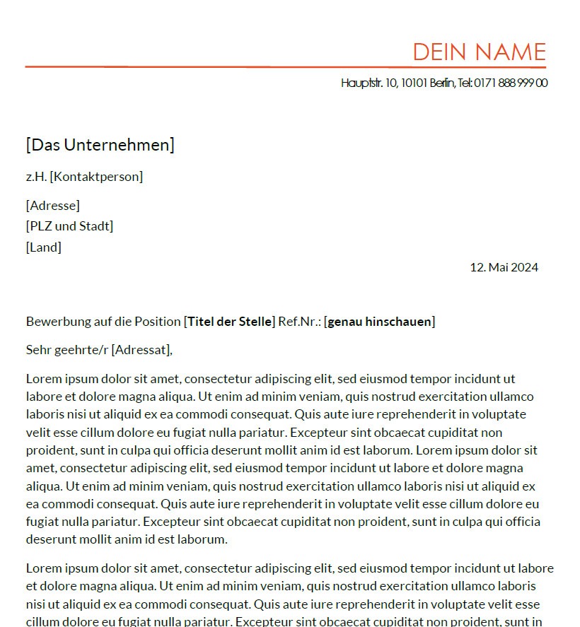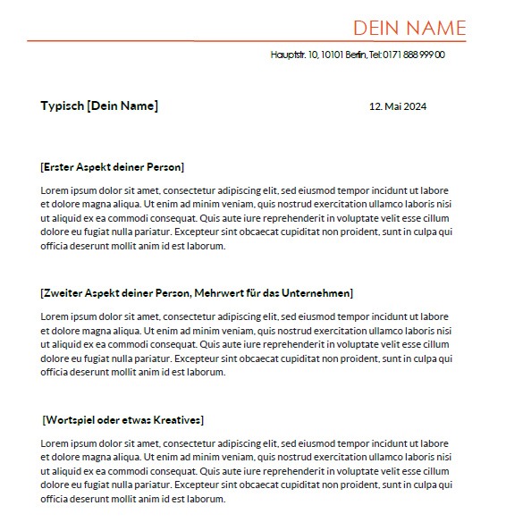 Das Anschreiben ist ein verpflichtendes Dokument für deine Bewerbung. Es sollte hinsichtlich des Designs ein paar Parallelen zum Lebenslauf besitzen.
